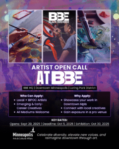 BBE HQ (Suite 200, 1128 Harmon Pl, Minneapolis) is excited to announce an Open Call for Artists! We are seeking local, BIPOC, and emerging artists to showcase their work in a special exhibition designed to bring vibrancy, creativity, and cultural energy to the Loring Park and Downtown Minneapolis community.